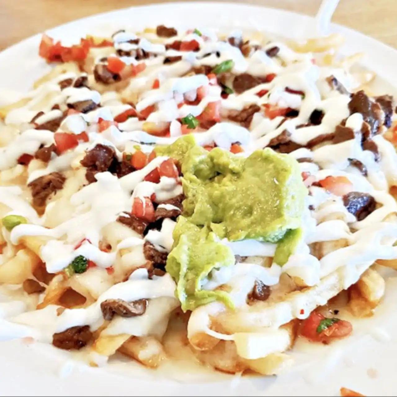 French fries, cheese, pico de gallo, guacamole and sour cream