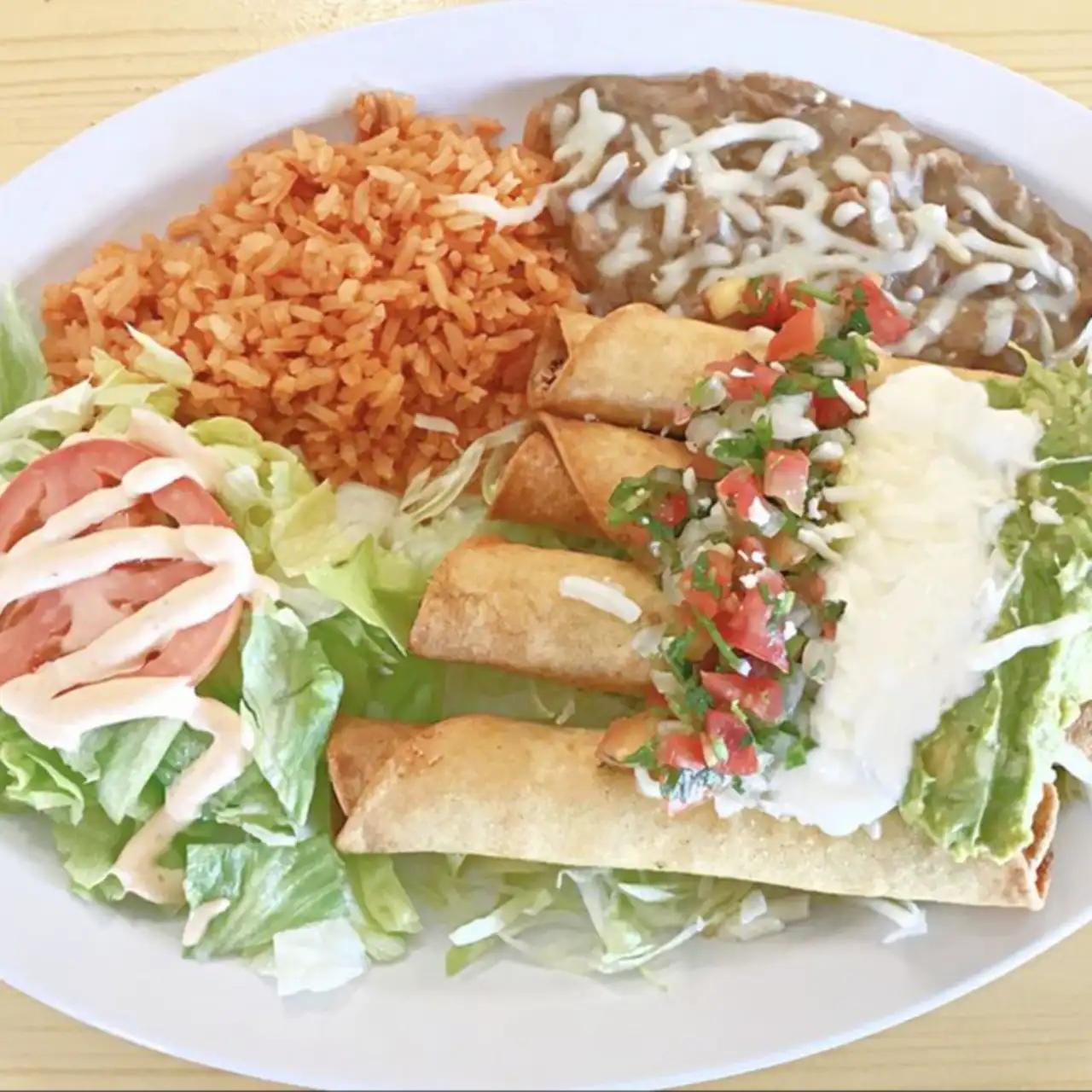 Fried chicken taquitos. Served with rice, refried beans, a small salad, guacamole, sour cream, and pico de gallo.